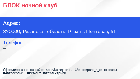 БЛОК, ночной клуб по адресу 390000, Рязанская область, Рязань, Почтовая, 61 в дальнейшем Организация, размещена в следующих категориях: