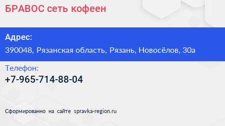 БРАВОС, сеть кофеен по адресу 390048, Рязанская область, Рязань, Новосёлов, 30а в дальнейшем Организация, размещена в следующих категориях: