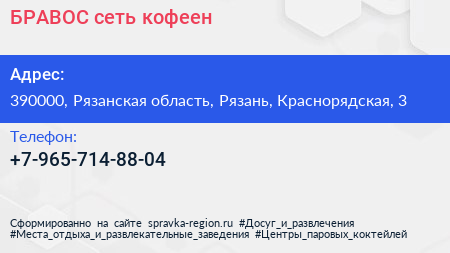 БРАВОС, сеть кофеен по адресу 390000, Рязанская область, Рязань, Краснорядская, 3 в дальнейшем Организация, размещена в следующих категориях: