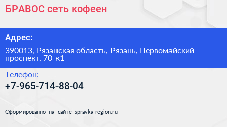 БРАВОС, сеть кофеен по адресу 390013, Рязанская область, Рязань, Первомайский проспект, 70 к1 в дальнейшем Организация, размещена в следующих категориях: