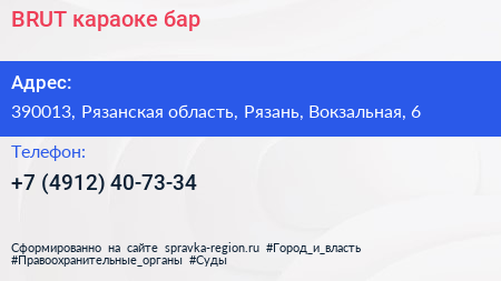 BRUT, караоке-бар по адресу 390013, Рязанская область, Рязань, Вокзальная, 6 в дальнейшем Организация, размещена в следующих категориях: