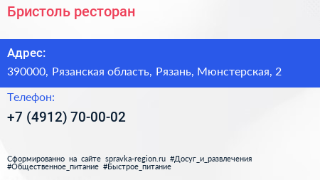 Бристоль, ресторан по адресу 390000, Рязанская область, Рязань, Мюнстерская, 2 в дальнейшем Организация, размещена в следующих категориях: