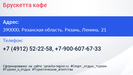 Брускетта, кафе по адресу 390000, Рязанская область, Рязань, Ленина, 21 в дальнейшем Организация, размещена в следующих категориях: