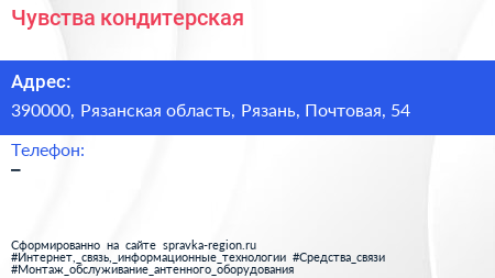 Чувства, кондитерская по адресу 390000, Рязанская область, Рязань, Почтовая, 54 в дальнейшем Организация, размещена в следующих категориях:
