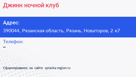 Джинн, ночной клуб по адресу 390044, Рязанская область, Рязань, Новаторов, 2 к7 в дальнейшем Организация, размещена в следующих категориях: