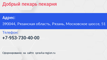 Добрый пекарь, пекарня по адресу 390044, Рязанская область, Рязань, Московское шоссе, 51 в дальнейшем Организация, размещена в следующих категориях: