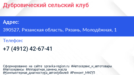Дубровический сельский клуб по адресу 390527, Рязанская область, Рязань, Молодёжная, 1 в дальнейшем Организация, размещена в следующих категориях: