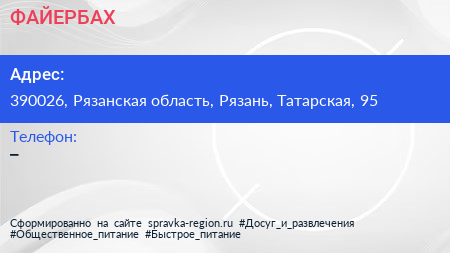 ФАЙЕРБАХ по адресу 390026, Рязанская область, Рязань, Татарская, 95 в дальнейшем Организация, размещена в следующих категориях: