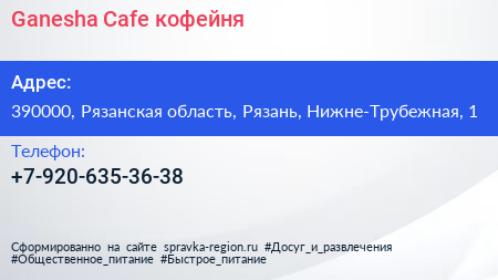 Ganesha Cafe, кофейня по адресу 390000, Рязанская область, Рязань, Нижне-Трубежная, 1 в дальнейшем Организация, размещена в следующих категориях: