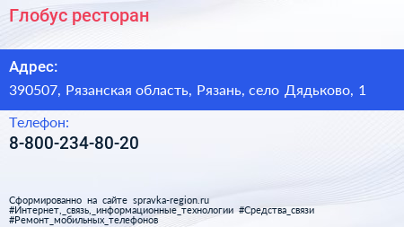 Глобус, ресторан по адресу 390507, Рязанская область, Рязань, село Дядьково, 1 в дальнейшем Организация, размещена в следующих категориях: