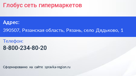Глобус, сеть гипермаркетов по адресу 390507, Рязанская область, Рязань, село Дядьково, 1 в дальнейшем Организация, размещена в следующих категориях: