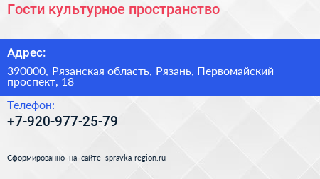 Гости, культурное пространство по адресу 390000, Рязанская область, Рязань, Первомайский проспект, 18 в дальнейшем Организация, размещена в следующих категориях: