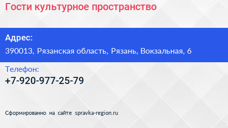 Гости, культурное пространство по адресу 390013, Рязанская область, Рязань, Вокзальная, 6 в дальнейшем Организация, размещена в следующих категориях: