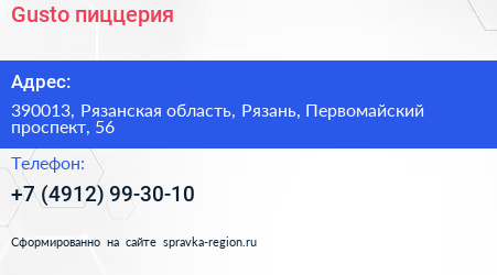 Gusto, пиццерия по адресу 390013, Рязанская область, Рязань, Первомайский проспект, 56 в дальнейшем Организация, размещена в следующих категориях: