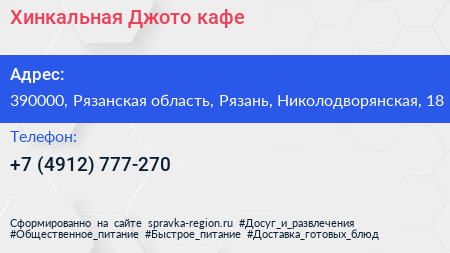 Хинкальная Джото, кафе по адресу 390000, Рязанская область, Рязань, Николодворянская, 18 в дальнейшем Организация, размещена в следующих категориях: