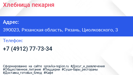 Хлебница, пекарня по адресу 390023, Рязанская область, Рязань, Циолковского, 3 в дальнейшем Организация, размещена в следующих категориях:
