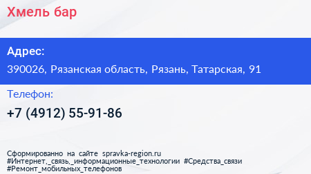 Хмель, бар по адресу 390026, Рязанская область, Рязань, Татарская, 91 в дальнейшем Организация, размещена в следующих категориях: