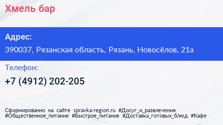 Хмель, бар по адресу 390037, Рязанская область, Рязань, Новосёлов, 21а в дальнейшем Организация, размещена в следующих категориях:
