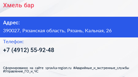 Хмель, бар по адресу 390027, Рязанская область, Рязань, Кальная, 26 в дальнейшем Организация, размещена в следующих категориях: