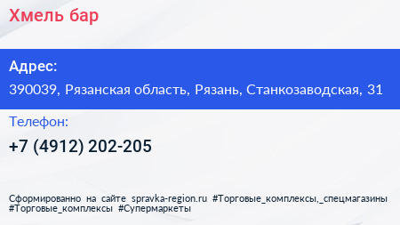 Хмель, бар по адресу 390039, Рязанская область, Рязань, Станкозаводская, 31 в дальнейшем Организация, размещена в следующих категориях: