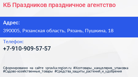 КБ Праздников, праздничное агентство по адресу 390005, Рязанская область, Рязань, Пушкина, 18 в дальнейшем Организация, размещена в следующих категориях: