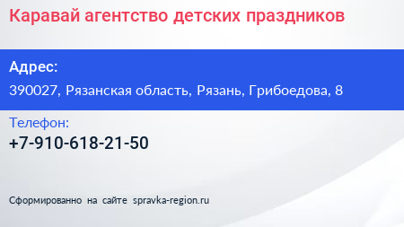 Каравай, агентство детских праздников по адресу 390027, Рязанская область, Рязань, Грибоедова, 8 в дальнейшем Организация, размещена в следующих категориях: