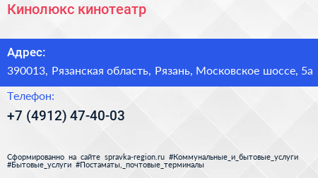 Кинолюкс, кинотеатр по адресу 390013, Рязанская область, Рязань, Московское шоссе, 5а в дальнейшем Организация, размещена в следующих категориях:
