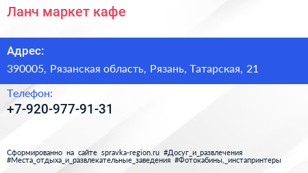Ланч маркет, кафе по адресу 390005, Рязанская область, Рязань, Татарская, 21 в дальнейшем Организация, размещена в следующих категориях: