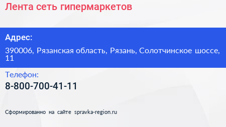 Лента, сеть гипермаркетов по адресу 390006, Рязанская область, Рязань, Солотчинское шоссе, 11 в дальнейшем Организация, размещена в следующих категориях: