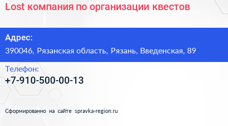 Lost, компания по организации квестов по адресу 390046, Рязанская область, Рязань, Введенская, 89 в дальнейшем Организация, размещена в следующих категориях: