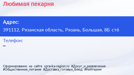 Любимая, пекарня по адресу 391112, Рязанская область, Рязань, Большая, 8Б ст6 в дальнейшем Организация, размещена в следующих категориях: