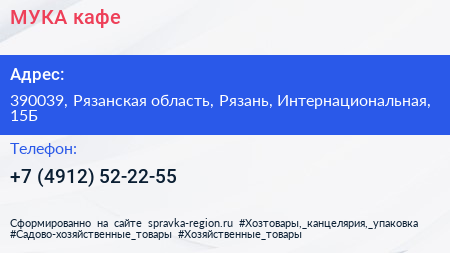 МУКА, кафе по адресу 390039, Рязанская область, Рязань, Интернациональная, 15Б в дальнейшем Организация, размещена в следующих категориях: