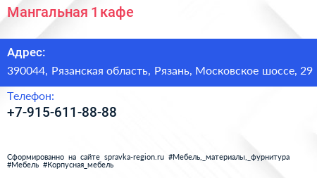 Мангальная №1, кафе по адресу 390044, Рязанская область, Рязань, Московское шоссе, 29 в дальнейшем Организация, размещена в следующих категориях:
