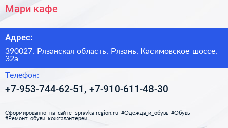 Мари, кафе по адресу 390027, Рязанская область, Рязань, Касимовское шоссе, 32а в дальнейшем Организация, размещена в следующих категориях: