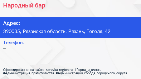 Народный, бар по адресу 390035, Рязанская область, Рязань, Гоголя, 42 в дальнейшем Организация, размещена в следующих категориях:
