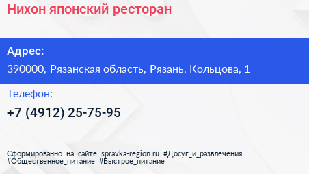 Нихон, японский ресторан по адресу 390000, Рязанская область, Рязань, Кольцова, 1 в дальнейшем Организация, размещена в следующих категориях: