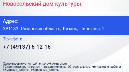 Новосельский дом культуры по адресу 391133, Рязанская область, Рязань, Пирогова, 2 в дальнейшем Организация, размещена в следующих категориях: