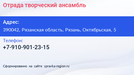 Отрада, творческий ансамбль по адресу 390042, Рязанская область, Рязань, Октябрьская, 5 в дальнейшем Организация, размещена в следующих категориях: