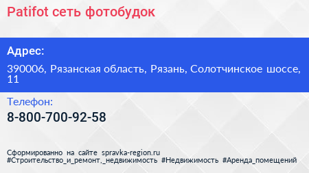 Patifot, сеть фотобудок по адресу 390006, Рязанская область, Рязань, Солотчинское шоссе, 11 в дальнейшем Организация, размещена в следующих категориях: