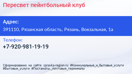 Пересвет, пейнтбольный клуб по адресу 391110, Рязанская область, Рязань, Вокзальная, 1а в дальнейшем Организация, размещена в следующих категориях: