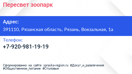Пересвет, зоопарк по адресу 391110, Рязанская область, Рязань, Вокзальная, 1а в дальнейшем Организация, размещена в следующих категориях:
