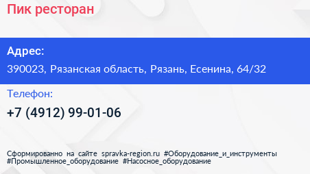 Пик, ресторан по адресу 390023, Рязанская область, Рязань, Есенина, 64/32 в дальнейшем Организация, размещена в следующих категориях:
