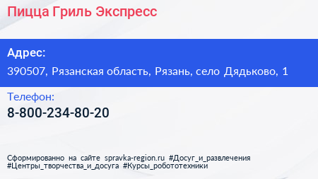 Пицца-Гриль Экспресс по адресу 390507, Рязанская область, Рязань, село Дядьково, 1 в дальнейшем Организация, размещена в следующих категориях: