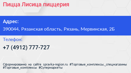 Пицца Лисица, пиццерия по адресу 390044, Рязанская область, Рязань, Мервинская, 2Б в дальнейшем Организация, размещена в следующих категориях: