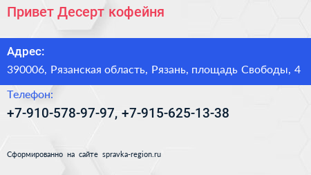 Привет, Десерт!, кофейня по адресу 390006, Рязанская область, Рязань, площадь Свободы, 4 в дальнейшем Организация, размещена в следующих категориях: