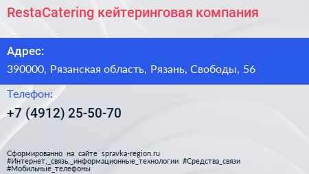 RestaCatering, кейтеринговая компания по адресу 390000, Рязанская область, Рязань, Свободы, 56 в дальнейшем Организация, размещена в следующих категориях: