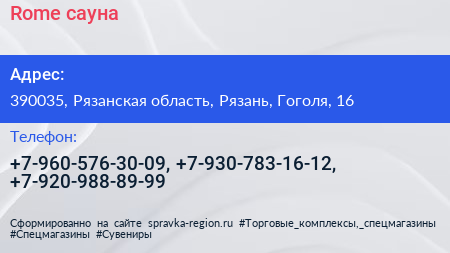 Rome, сауна по адресу 390035, Рязанская область, Рязань, Гоголя, 16 в дальнейшем Организация, размещена в следующих категориях: