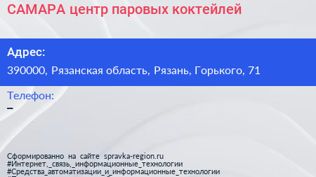 САМАРА, центр паровых коктейлей по адресу 390000, Рязанская область, Рязань, Горького, 71 в дальнейшем Организация, размещена в следующих категориях: