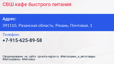 СВШ, кафе быстрого питания по адресу 391110, Рязанская область, Рязань, Почтовая, 1 в дальнейшем Организация, размещена в следующих категориях: