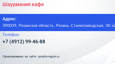 Шаурмания, кафе по адресу 390039, Рязанская область, Рязань, Станкозаводская, 30 к2 в дальнейшем Организация, размещена в следующих категориях: